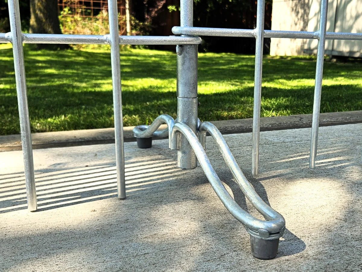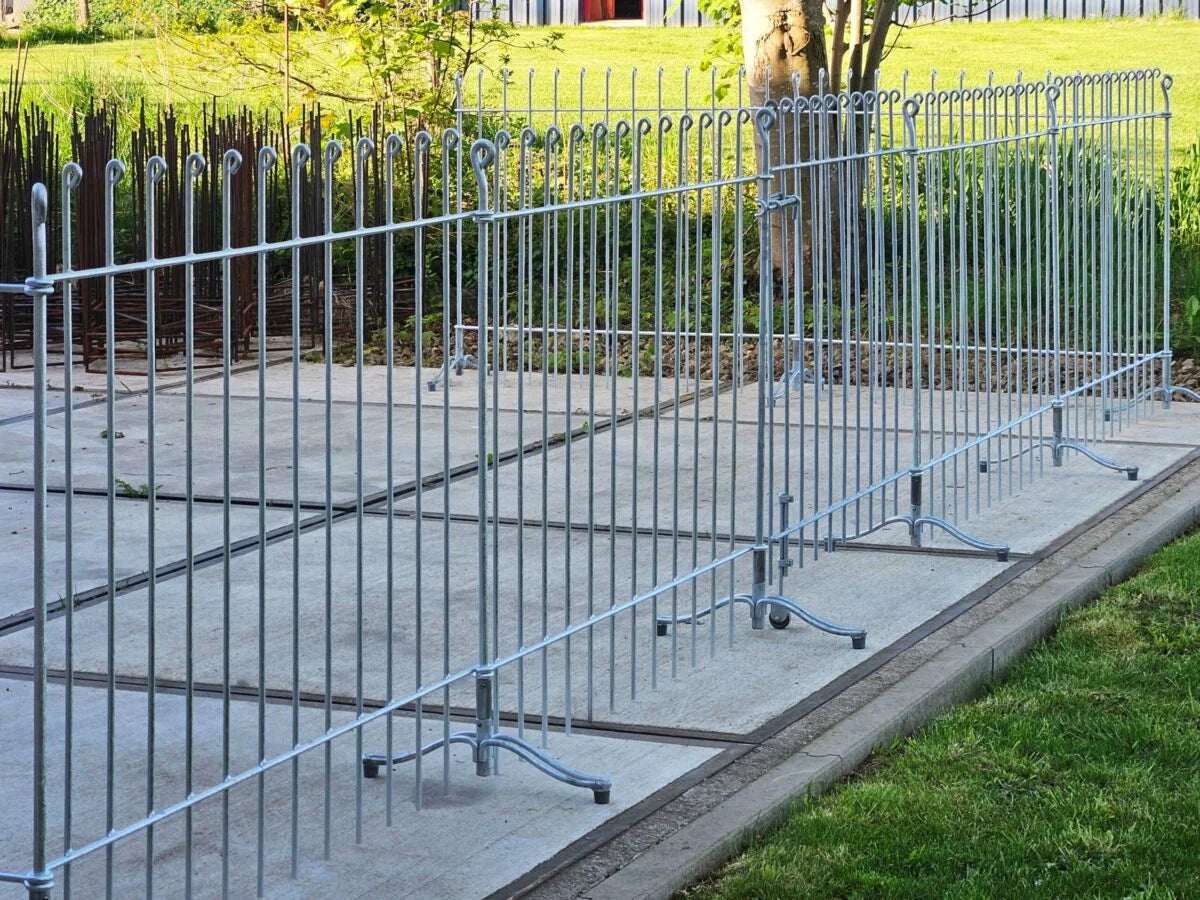 Dank der anschraubbaren Gummifüße werden empfindliche Bodenbeläge geschützt. Die Zaunelemente selbst berühren den Boden nicht; das gesamte Gewicht wird gleichmäßig über die Standfüße verteilt. Dadurch steht der Zaun äußerst stabil.